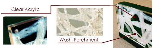 Japanese art washi in a small rectangular acrylic stand gives you contemporary Zen feel. internal universe captured in thick polished acrylic.